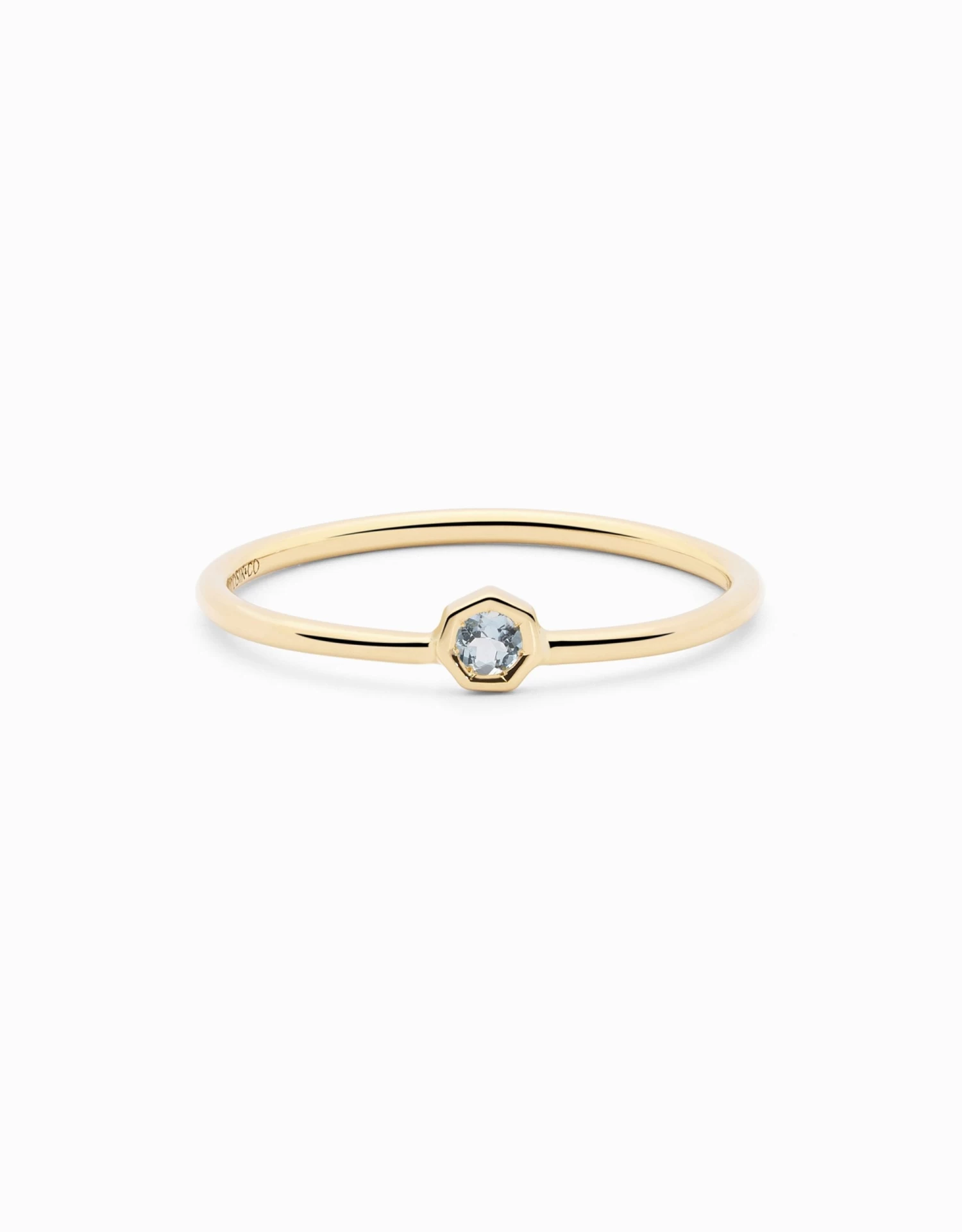 En aquest anell, un hept脿gon d鈥檕r embolcalla la pedra preciosa i li cedeix tot el protagonisme. L鈥檈spurna de color que aporta la delicada aiguamarina blava el fa captivador als ulls de qui el mira i de qui el porta! Una joia subtil i d鈥檜na gran frescor pensada per a combinar-se amb d鈥檃ltres anells de la mateixa s猫rie amb diferents gemmes de colors: rob铆, maragda, safir rosa, safir groc, safir blau i diamant.聽