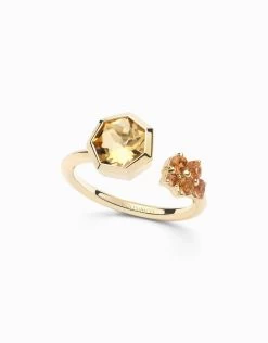 Un anell d’un contrast únic i bell, gràcies a la combinació que Jordi Rosich -joier, clavador, gemmòleg i dissenyador de Roosik&Co- realitza amb especial cura. En aquesta joia, l’anella d’or groc uneix 1 Citrí amb 5 Safirs grocs. Els safirs d’aquest color són pedres precioses molt especials, a causa de la seva raresa en la natura. Per la seva banda, el Citrí es presenta en talla heptagonal, exclusiva de Roosik&Co, fet que aporta una reflexió de la llum única i molt bella a aquesta gemma. Anell disponible amb d’altres combinacions d’or i pedres precioses de tons blaus, verds i roses.