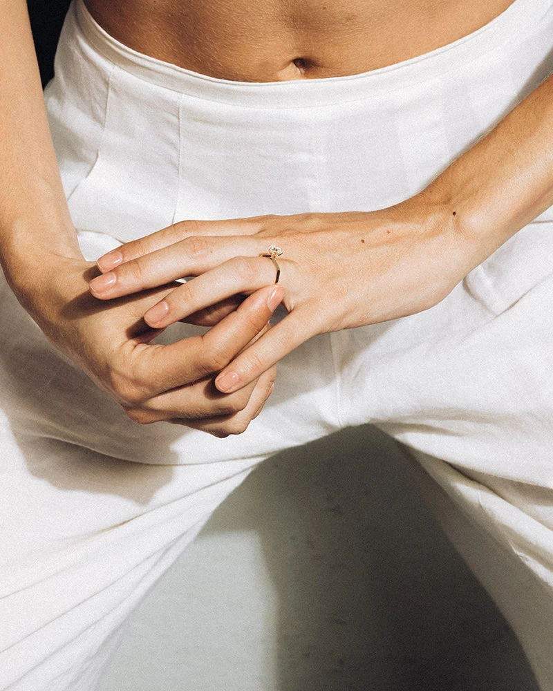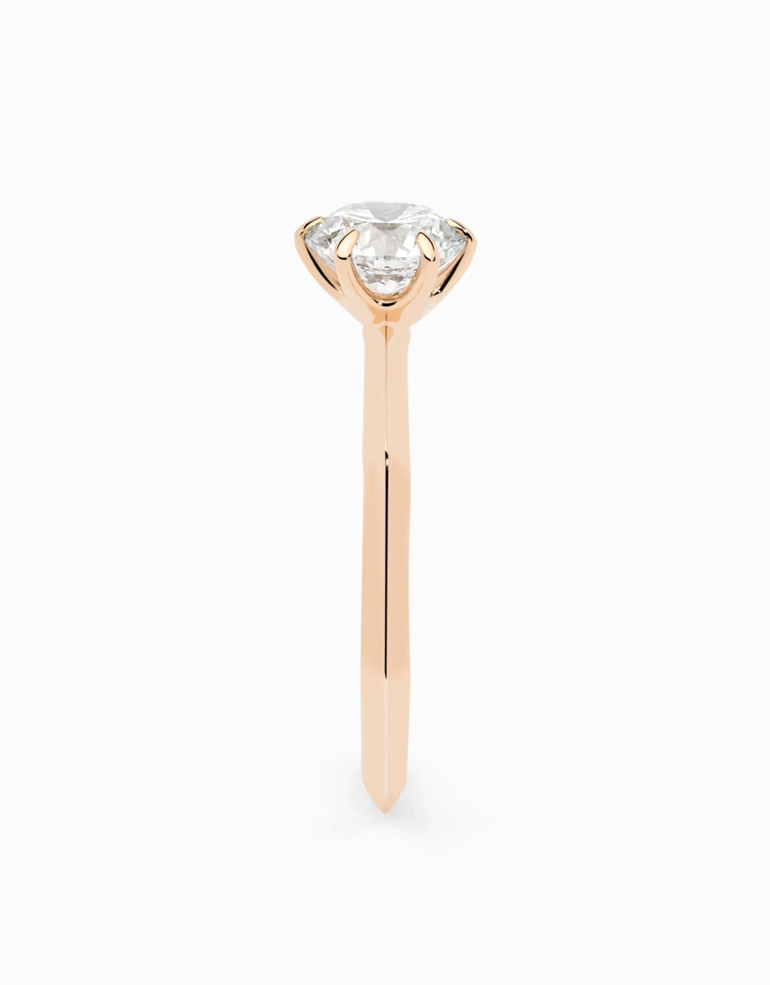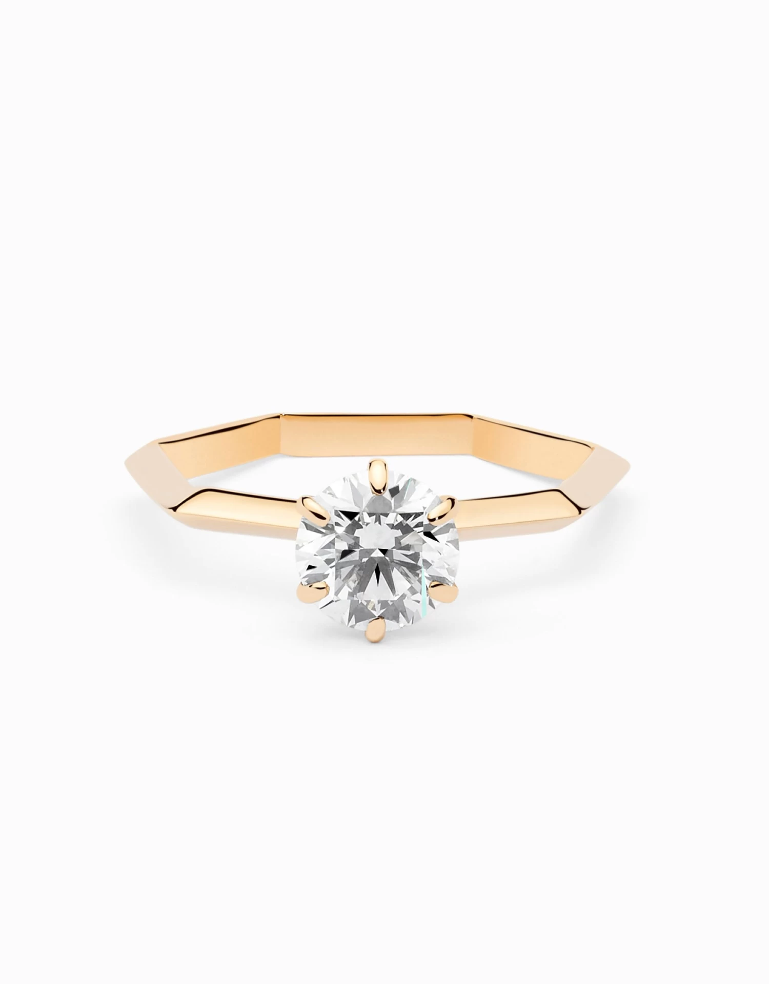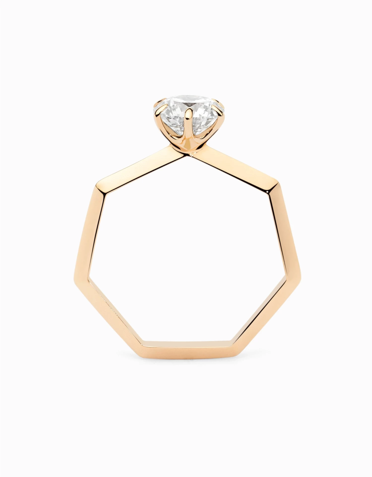M茅s Roosik & Co que mai. Un anell que posa en dubte tots els impossibles i trenca amb el classisme dels anells de comprom铆s聽convencionals. Les l铆nies geom猫triques i minimalistes de l’anell en forma d’hept脿gon eleven el diamant, de triple聽excel路l猫ncia, quasi fent que suri聽en la teva m脿.聽
