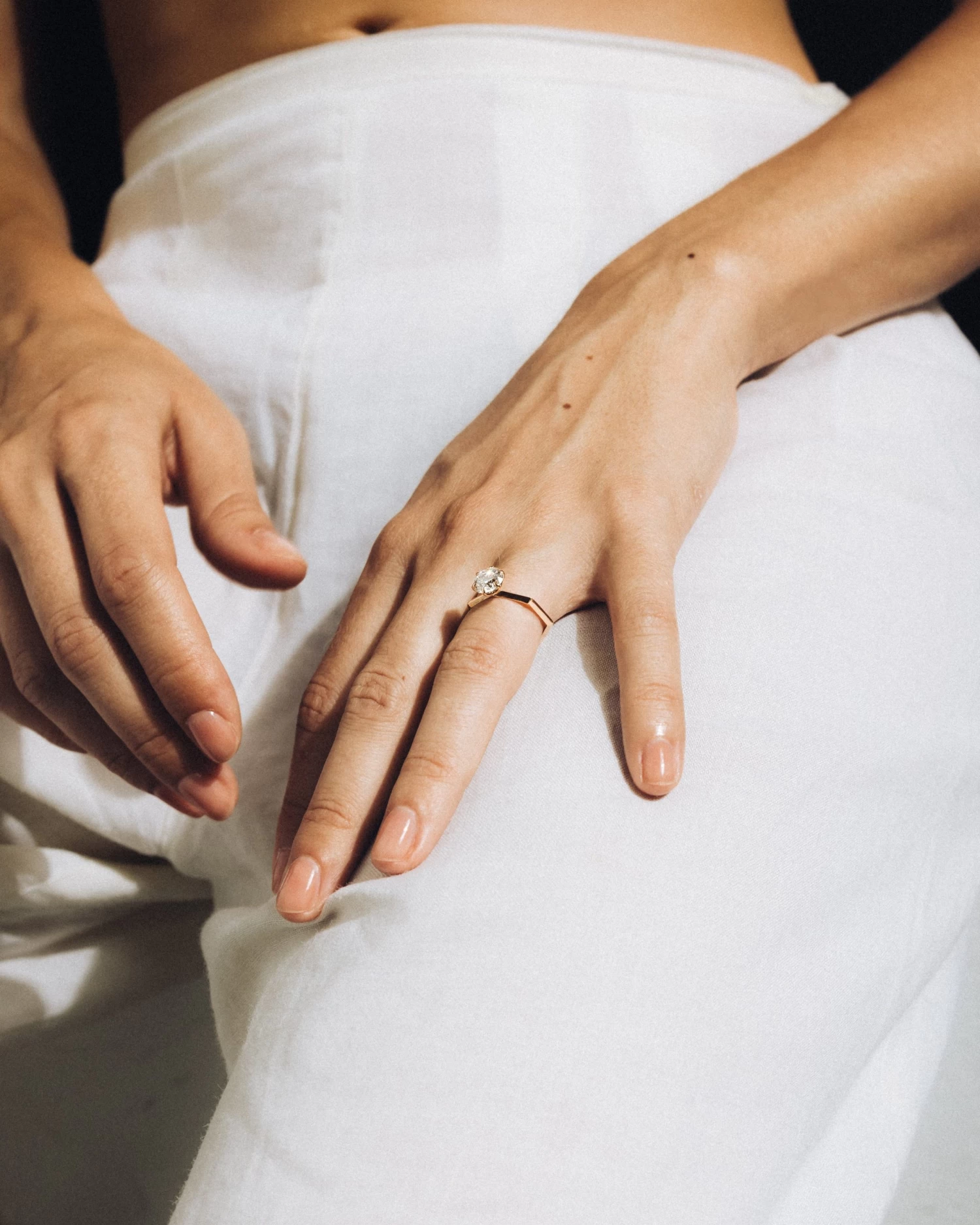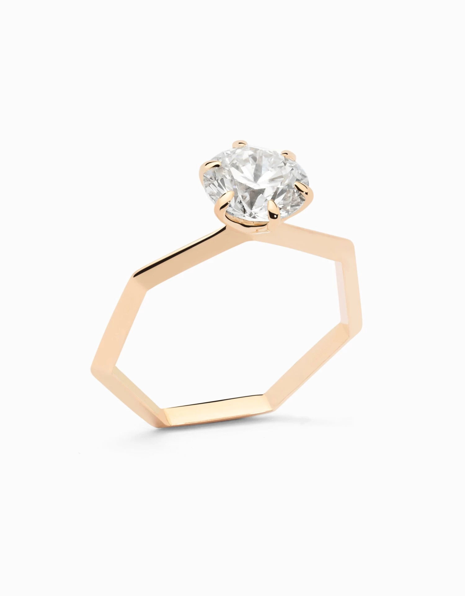 M茅s Roosik & Co que mai. Un anell que posa en dubte tots els impossibles i trenca amb el classisme dels anells de comprom铆s聽convencionals. Les l铆nies geom猫triques i minimalistes de l’anell en forma d’hept脿gon eleven el diamant, de triple聽excel路l猫ncia, quasi fent que suri聽en la teva m脿.聽