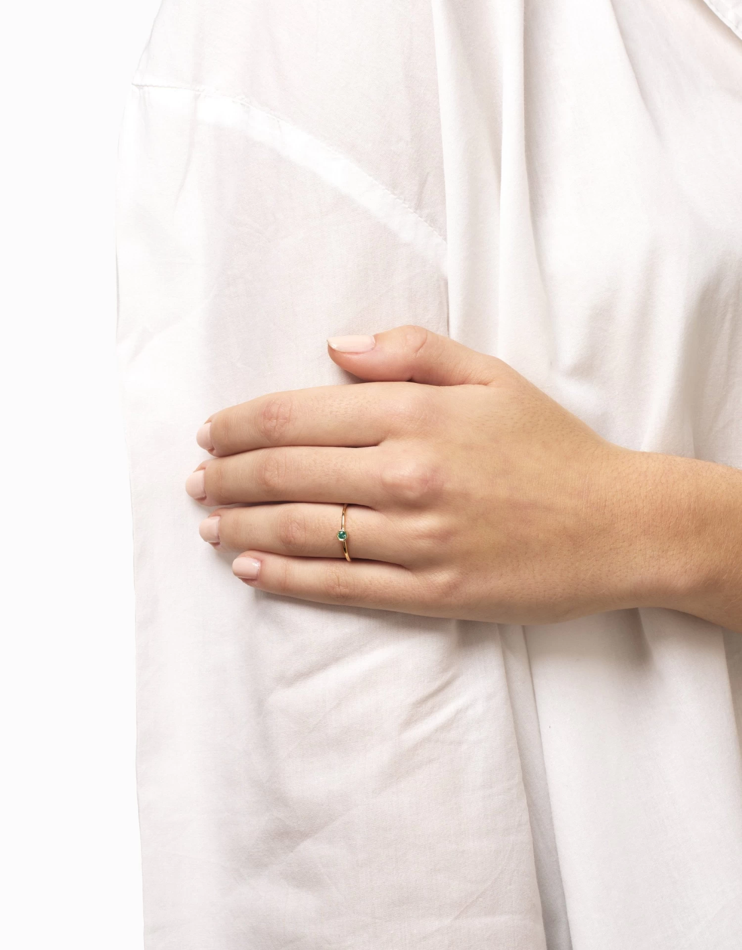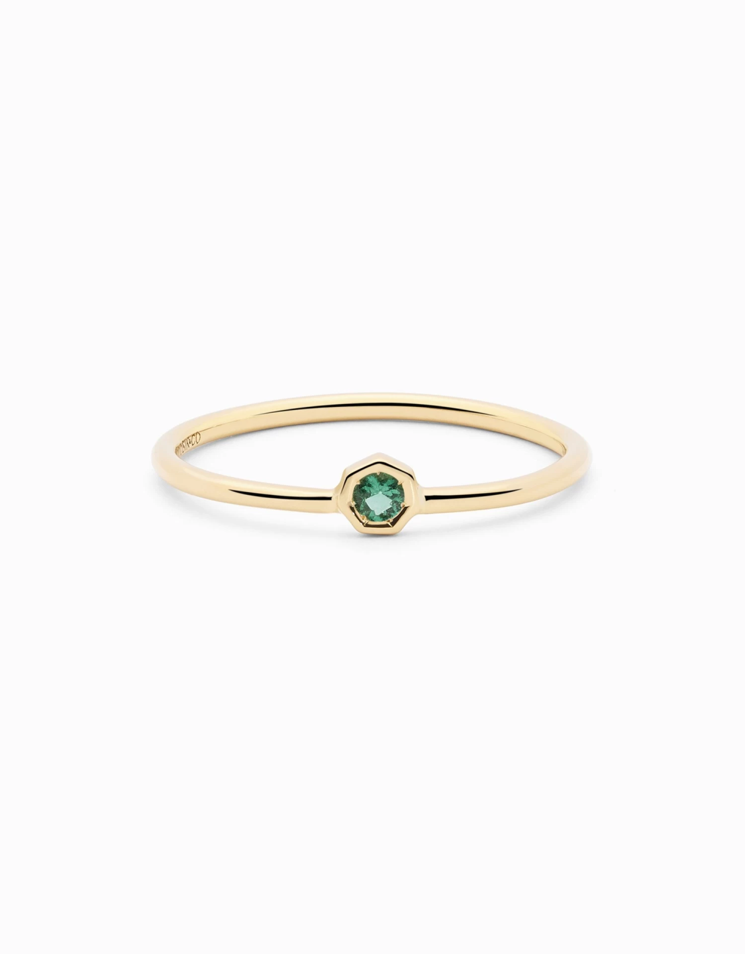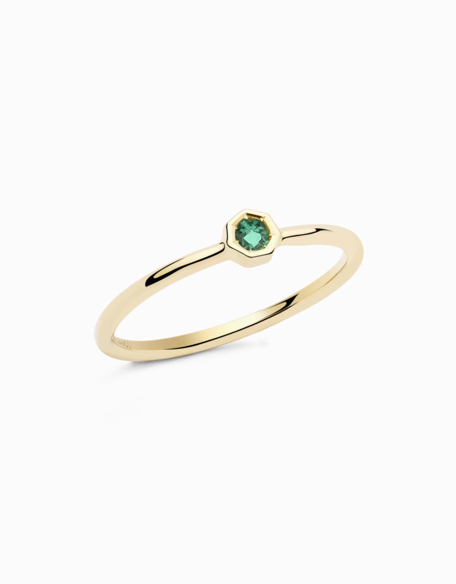 En aquest anell, un hept脿gon d鈥檕r embolcalla la pedra preciosa i li cedeix tot el protagonisme. L鈥檈spurna de color que aporta la maragda d鈥檜n to verd intens el fan captivador als ulls de qui el mira i de qui el porta. Una joia subtil i delicada pensada per a combinar-se amb d鈥檃ltres anells de la mateixa s猫rie amb diferents gemmes de colors: rob铆, aiguamarina, safir rosa, safir groc, safir blau i diamant.