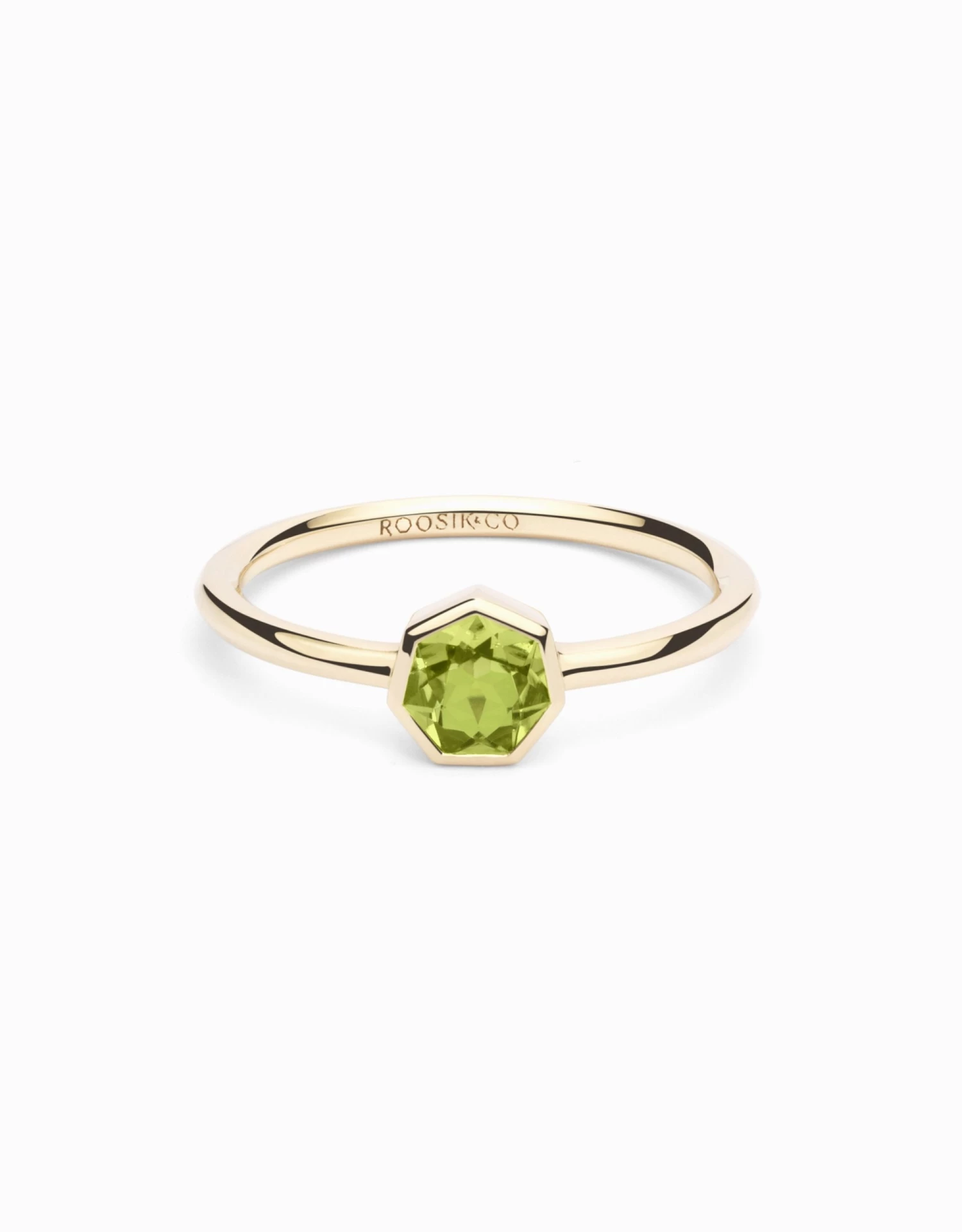 Un dels protagonistes de la col·lecció basada en la pedra amb un tall exclusiu i dissenyat per Jordi Rosich, l’Heptastone; l’anell Glow, que es realitza en diferents acabats d’or i gemmes naturals. En aquest cas, Jordi Rosich -joier, clavador, gemmòleg i dissenyador de Roosik&Co.-, combina l’or groc amb un Peridot. Sol o en una divertida combinació amb altres acabats, l’anell Glow és un valor segur que agradarà a tot tipus de dona. Ideal també si es conjunta amb les arracades i penjoll de la mateixa col·lecció o amb altres anells Glow.