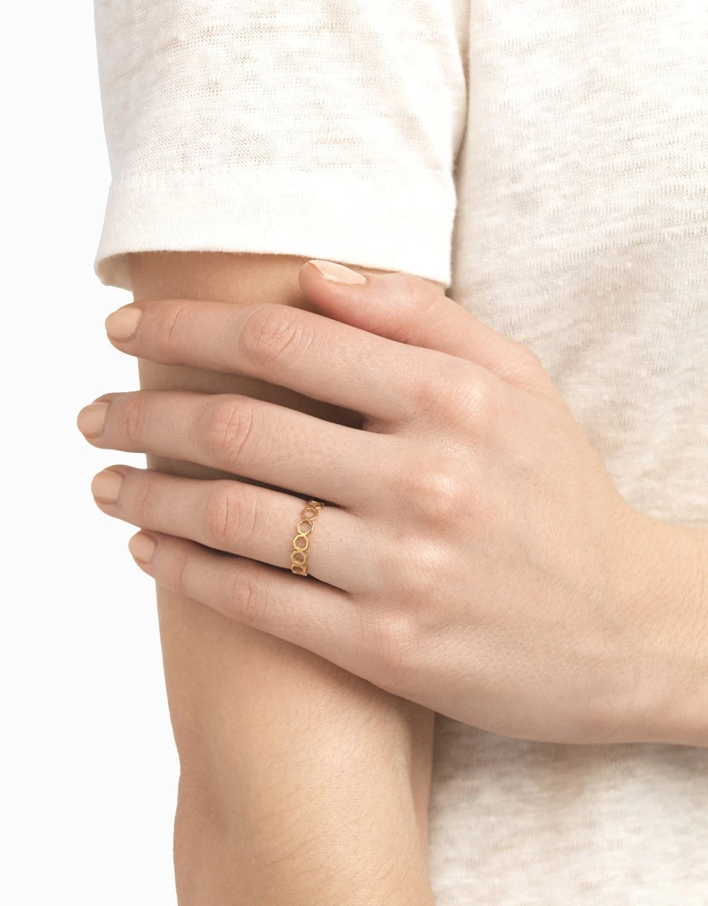 La bellesa de la geometria és la protagonista absoluta d’aquest anell, que destaca per la puresa del seu disseny, en què Rosich dibuixa amb precisió el perímetre de l’Heptàgon. La línia pura de la figura geomètrica i el treball en metall, sense ornaments afegits, ressalta la bellesa de les formes en una joia que captiva per la seva perfecció formal, amb un estil molt contemporani que harmonitzarà perfectament amb un perfil de dona actual i emprenedora.