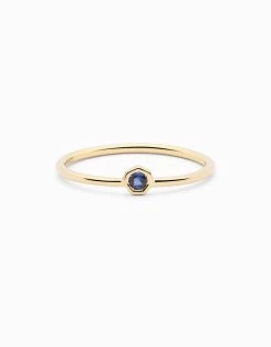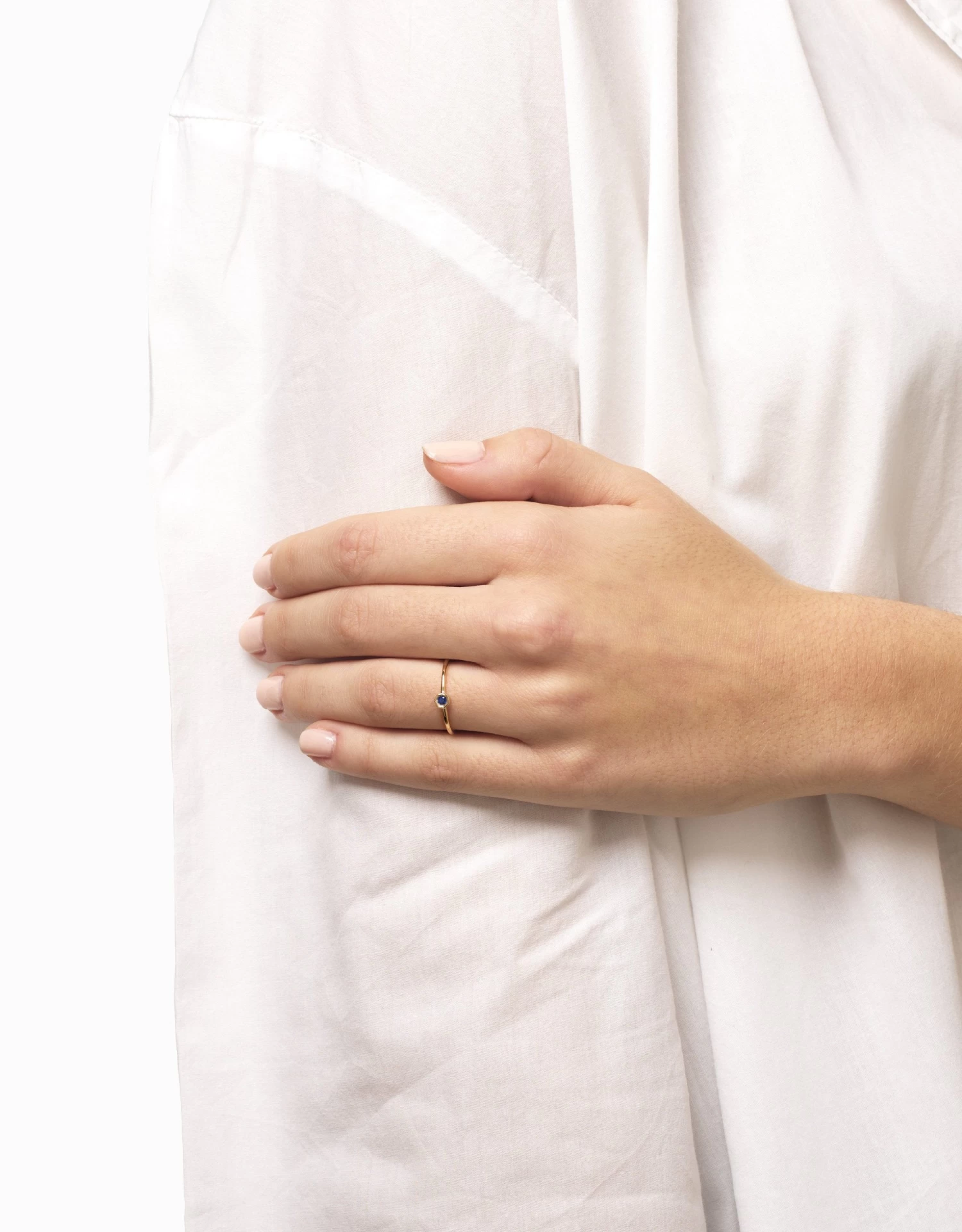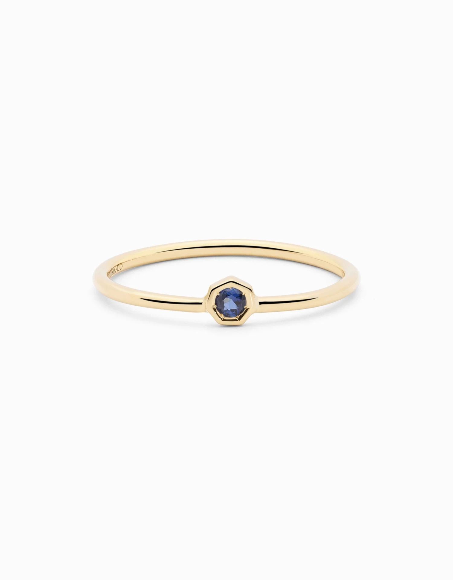 En aquest anell, un hept脿gon d鈥檕r embolcalla la pedra preciosa i li cedeix tot el protagonisme. L鈥檈spurna de color que aporta el safir blau el fan captivador als ulls de qui el mira i de qui el porta. Una joia seductora i delicada pensada per a combinar-se amb d鈥檃ltres anells de la mateixa s猫rie amb diferents gemmes de colors: rob铆, maragda, aiguamarina, safir rosa, safir groc i diamant.
