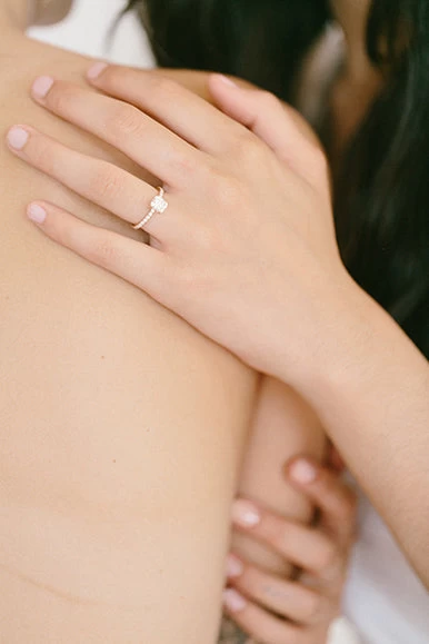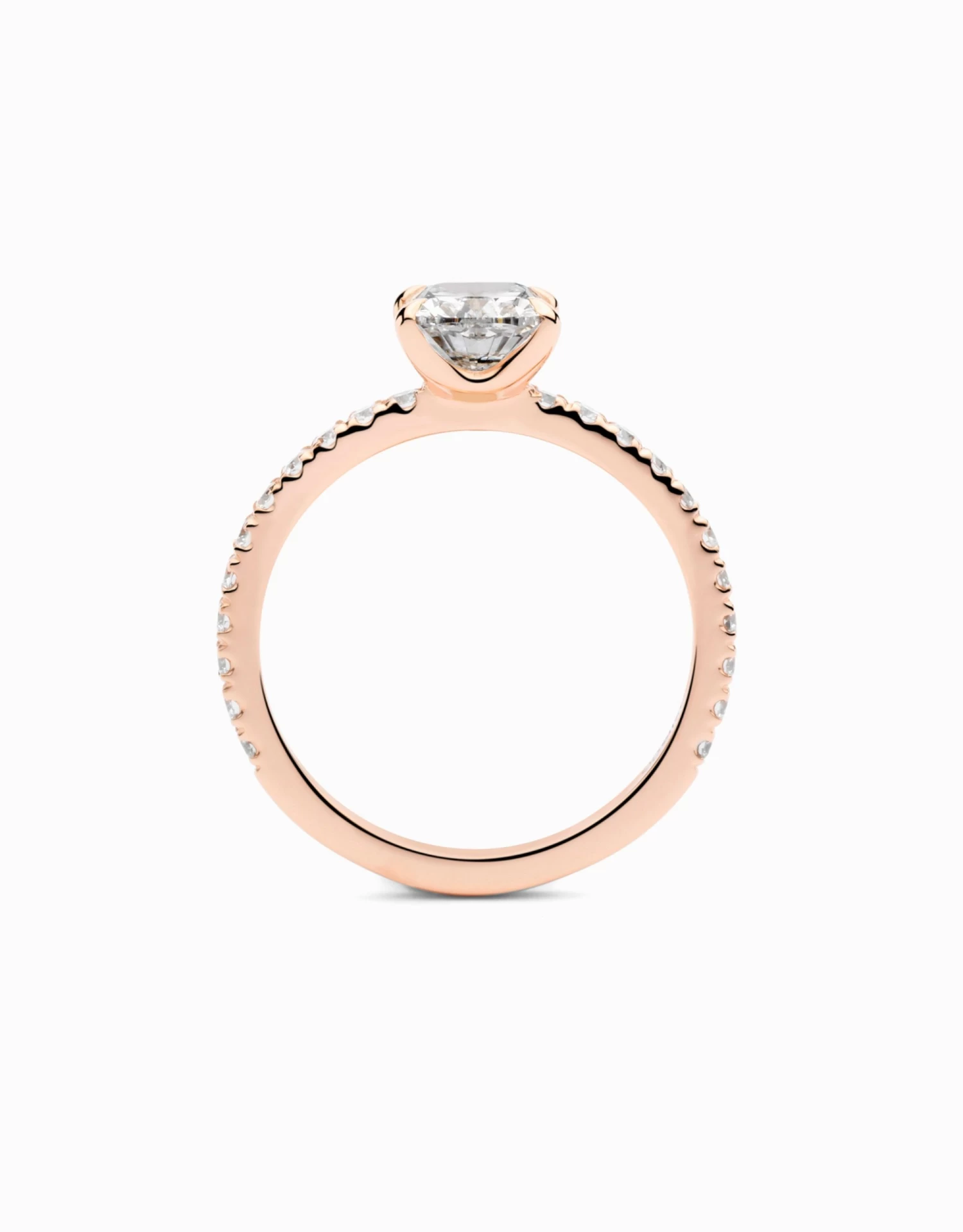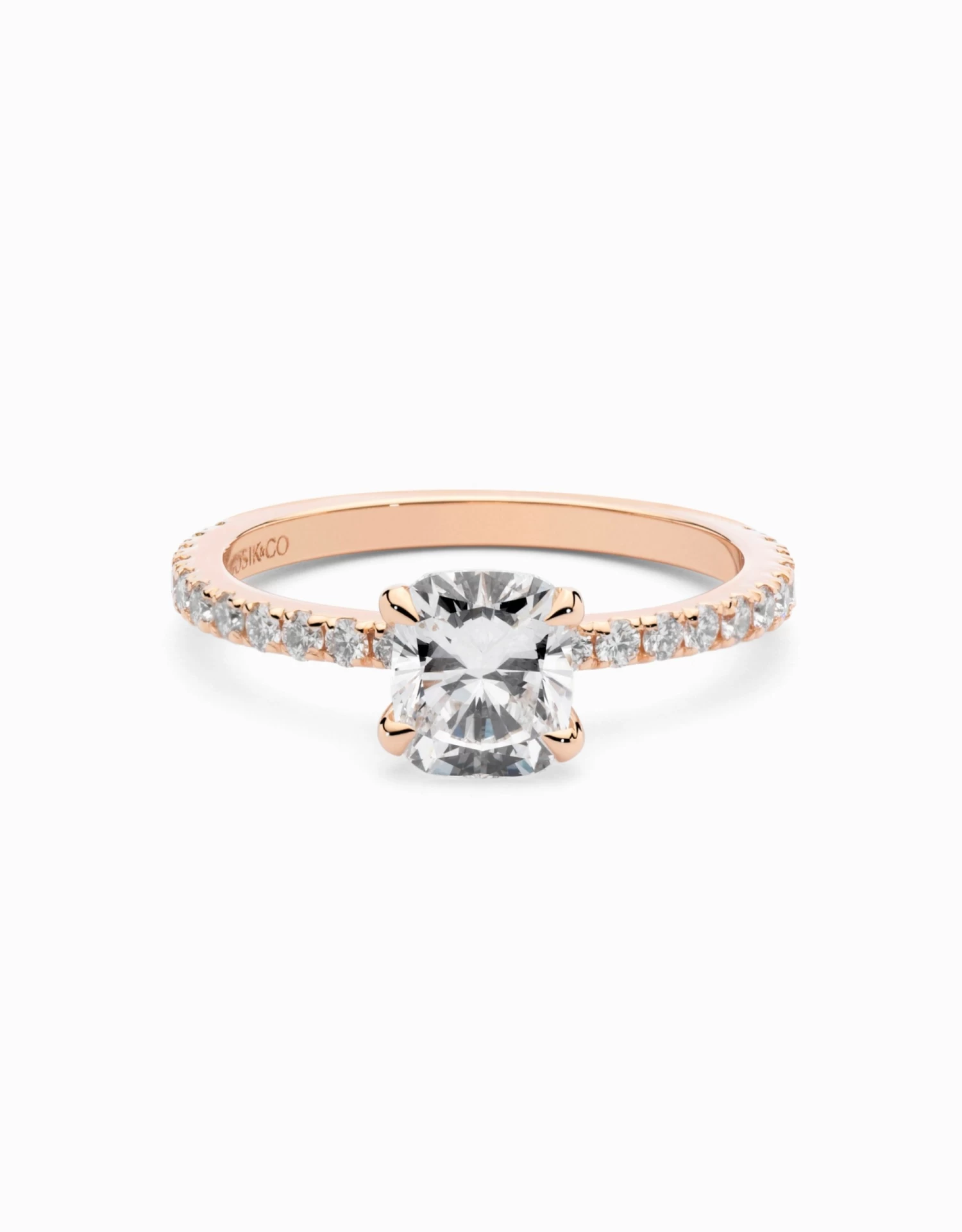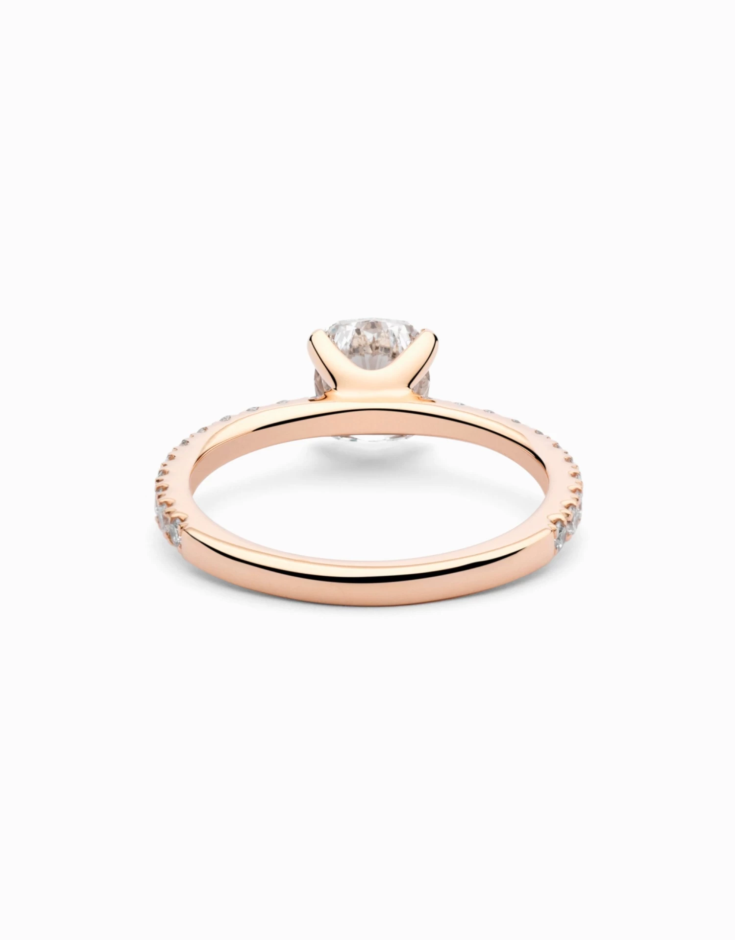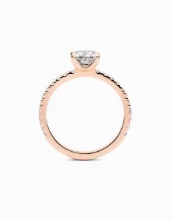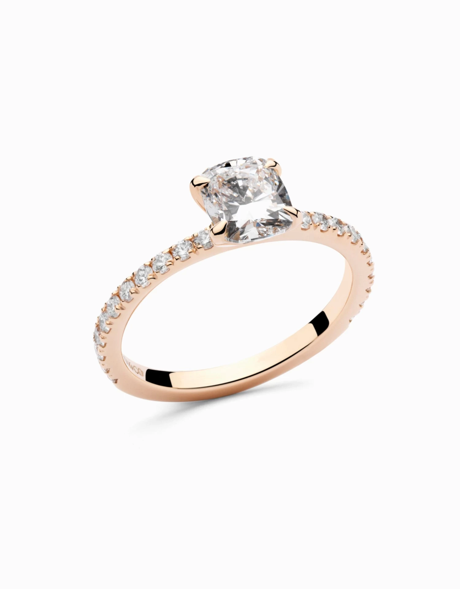El solitari clàssic i la mitja aliança de diamants se sumen en aquest espectacular anell de compromís treballat a mà per Jordi Rosich i el seu equip de joiers i clavadors. Una seqüència de 24 diamants naturals acompanyen el diamant central d’1 quirat, en talla coixí. Un anell clàssic magnífic, d’una extremada brillantor, treballat en or rosa de 18k per tal d’aportar-li la calidesa i el romanticisme propi de les grans ocasions. L’or rosa ressaltarà la blancor dels diamants i es fondrà amb el color de la pell. Roosik & Co treballa aquesta joia amb d’altres opcions de diamant i en or groc, or blanc i platí.