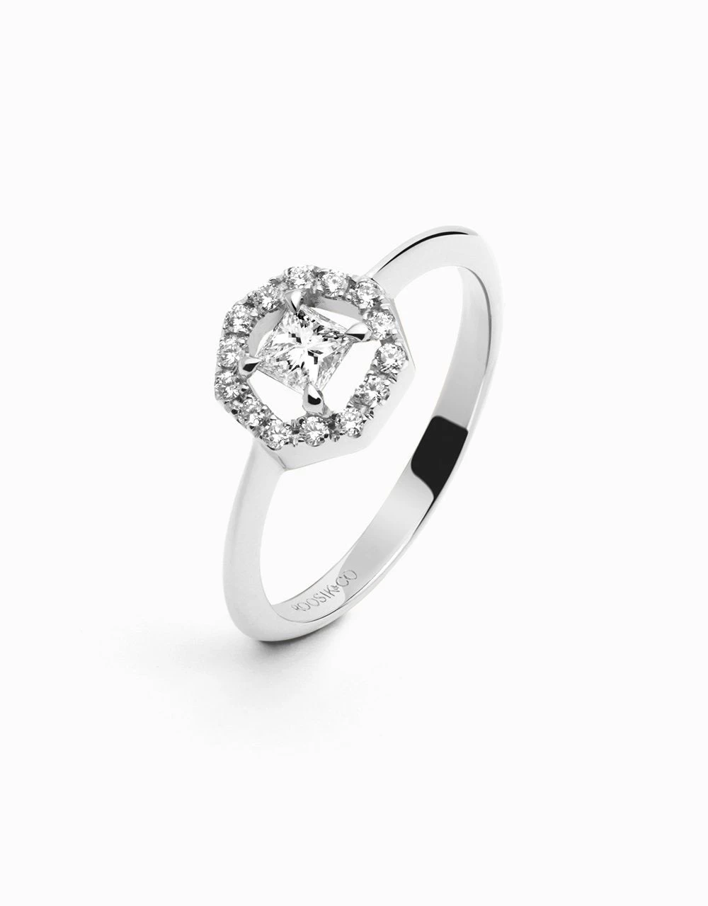 L’anell de compromís més especial de Roosik&Co. Jordi Rosich – joier, clavador, gemmòleg i dissenyador de la marca- ha treballat aquesta peça de gran elegància i singularitat amb línies sinuoses que posen de relleu el més brillant dels heptàgons. Al bell mig de la peça, el protagonista és un diamant en talla princesa de 0,20 quirats, certificat per Jordi Rosich. La princesa s’envolta de 14 diamants disposats en seqüència, seguint la forma geomètrica i minimalista de l’icònic Heptasik de Roosik&Co. Aquesta joia feta a mà s’ofereix també en or rosa i or groc.