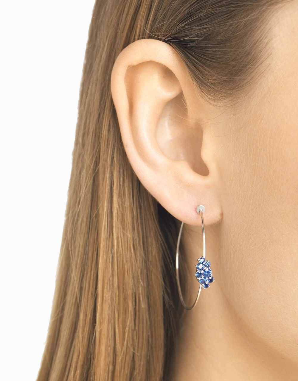 Una de les joies m茅s divertides i ocurrents de Jordi Rosich per a la s猫rie Bunch de la col路lecci贸 Blossom de Roosik&Co. Les cl脿ssiques criolles es presenten en or blanc, el punt d鈥檃treviment 茅s l鈥檃plicaci贸 del motiu protagonista de la s猫rie Bunch, el penjoll de safirs, en aquest cas en color blau. Un complement d鈥檜na enorme modernitat, per a dones d鈥檈sperit juvenil i desenfadat. Unes arracades molt f脿cils de portar gr脿cies a la tanca posterior que incorporen, que combinen perfectament amb聽looks聽frescos.