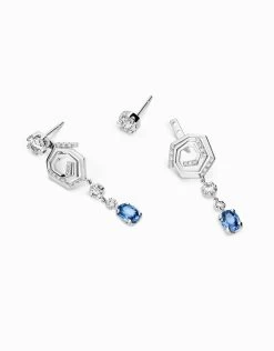 La part penjant, en or blanc de 18 quirats, està formada per un heptàgon geomètric en espiral amb diamants naturals brillant en quatre dels costats, seguit per dos diamants en cascada: un de 0,15 quirats i un altre de 0,05 quirats. La peça culmina amb un espectacular safir en talla oval d’1 quirat cadascun, amb un color blau profund i vibrant que aporta un contrast fascinant amb la lluminositat de l’or blanc i els diamants.