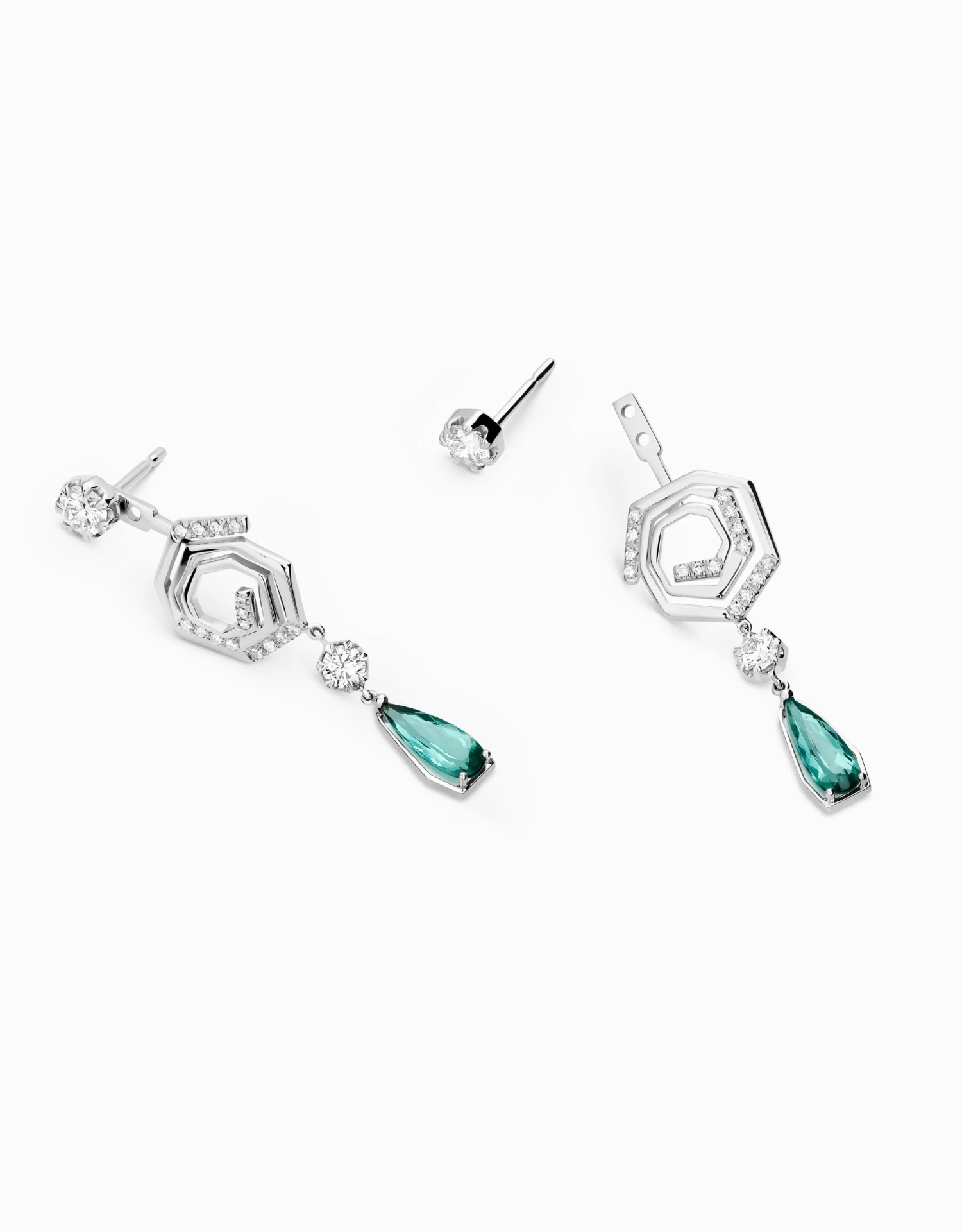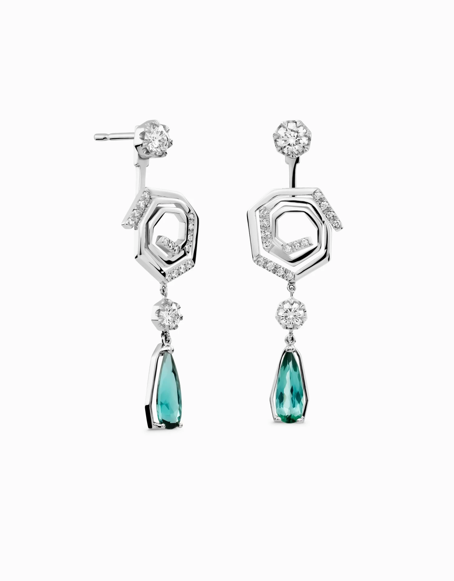 La part penjant, treballada en or blanc de 18 quirats, est脿 formada per un hept脿gon geom猫tric en forma d鈥檈spiral en el que llueixen diamants naturals en quatre dels costatas costats, seguit d鈥檜n diamant brillant que aporta encara m茅s llum i eleg脿ncia. El toc final 茅s una espectacular turmalina en talla pera, amb un color verd turquesa profund que crea un contrast fascinant amb la brillantor de l鈥檕r blanc i els diamants.