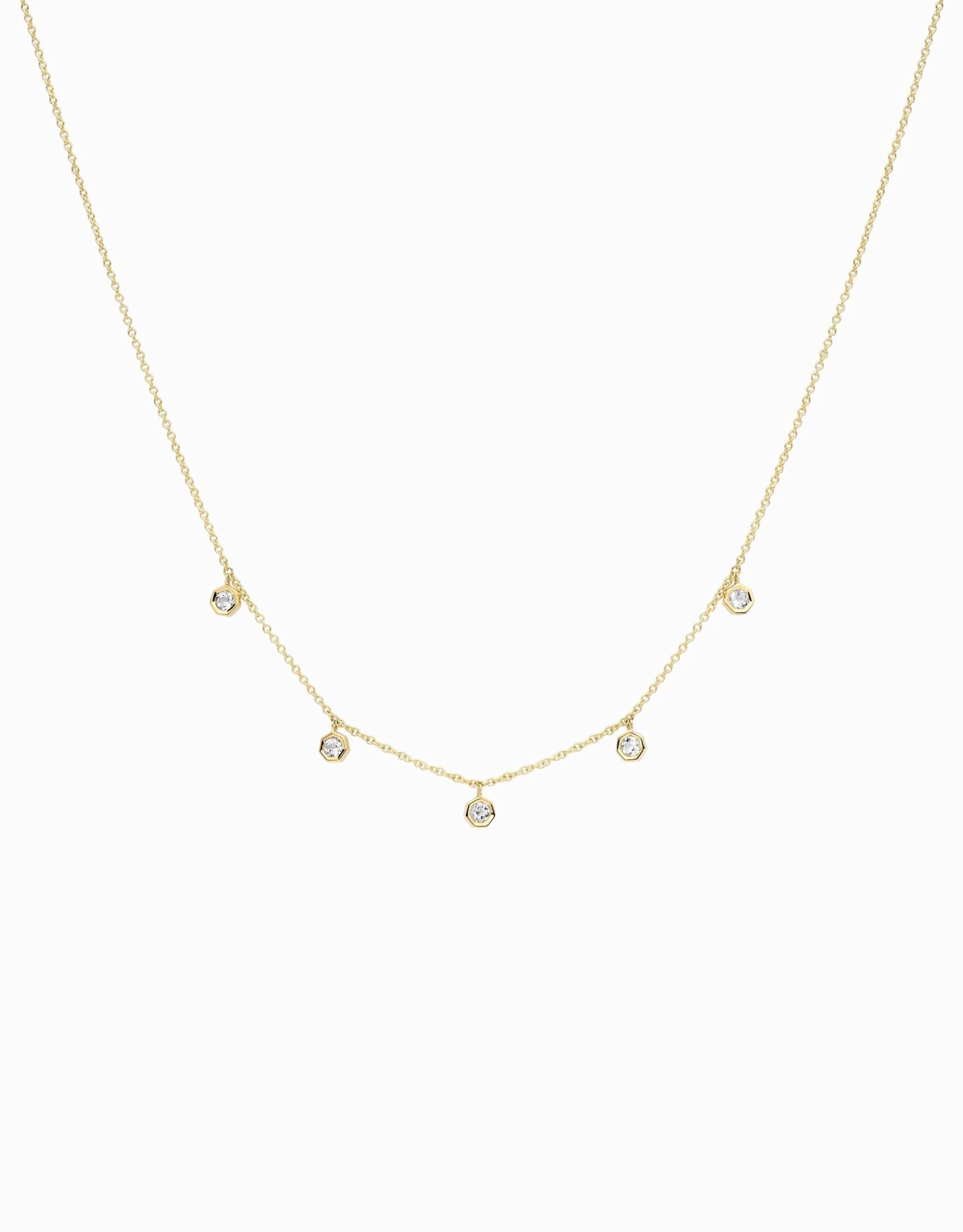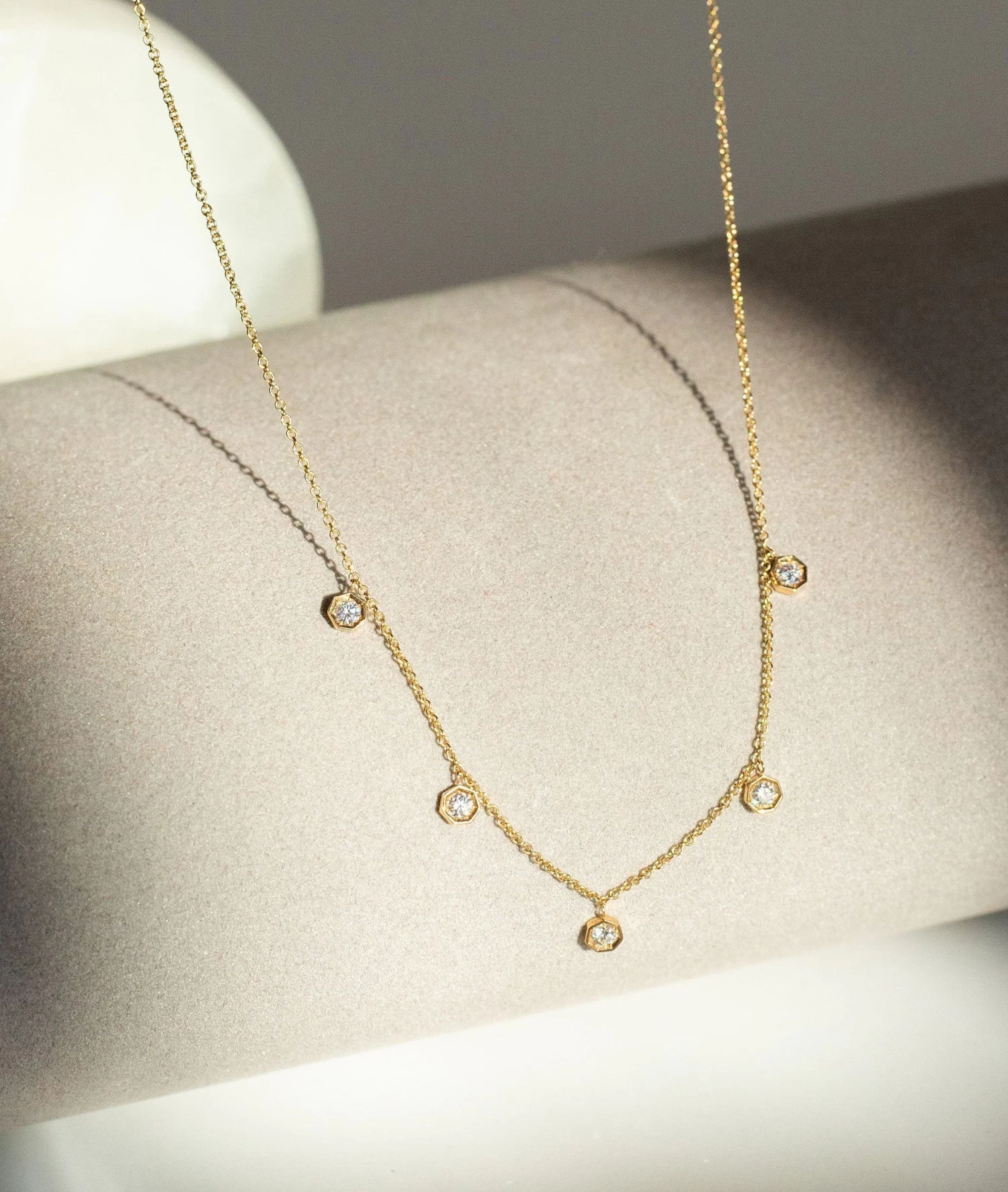En aquest penjoll, cinc diamants de gran bellesa i lluminositat s鈥檈mbolcallen dels hept脿gons d鈥檕r, la figura ic貌nica de Roosik & Co. Una joia subtil i original per a portar-la cada dia i que alhora estar脿 a l鈥檃l莽ada de les ocasions m茅s especials. Es treballa amb 1, 3 i 5 hept脿gons i s鈥檕fereix amb d鈥檃ltres pedres precioses: rob铆, maragda, aiguamarina, safir rosa, safir groc i safir blau. Jordi Rosich tamb茅 ha dissenyat les polseres i els anells de la mateixa s猫rie per a fer un bonic conjunt.