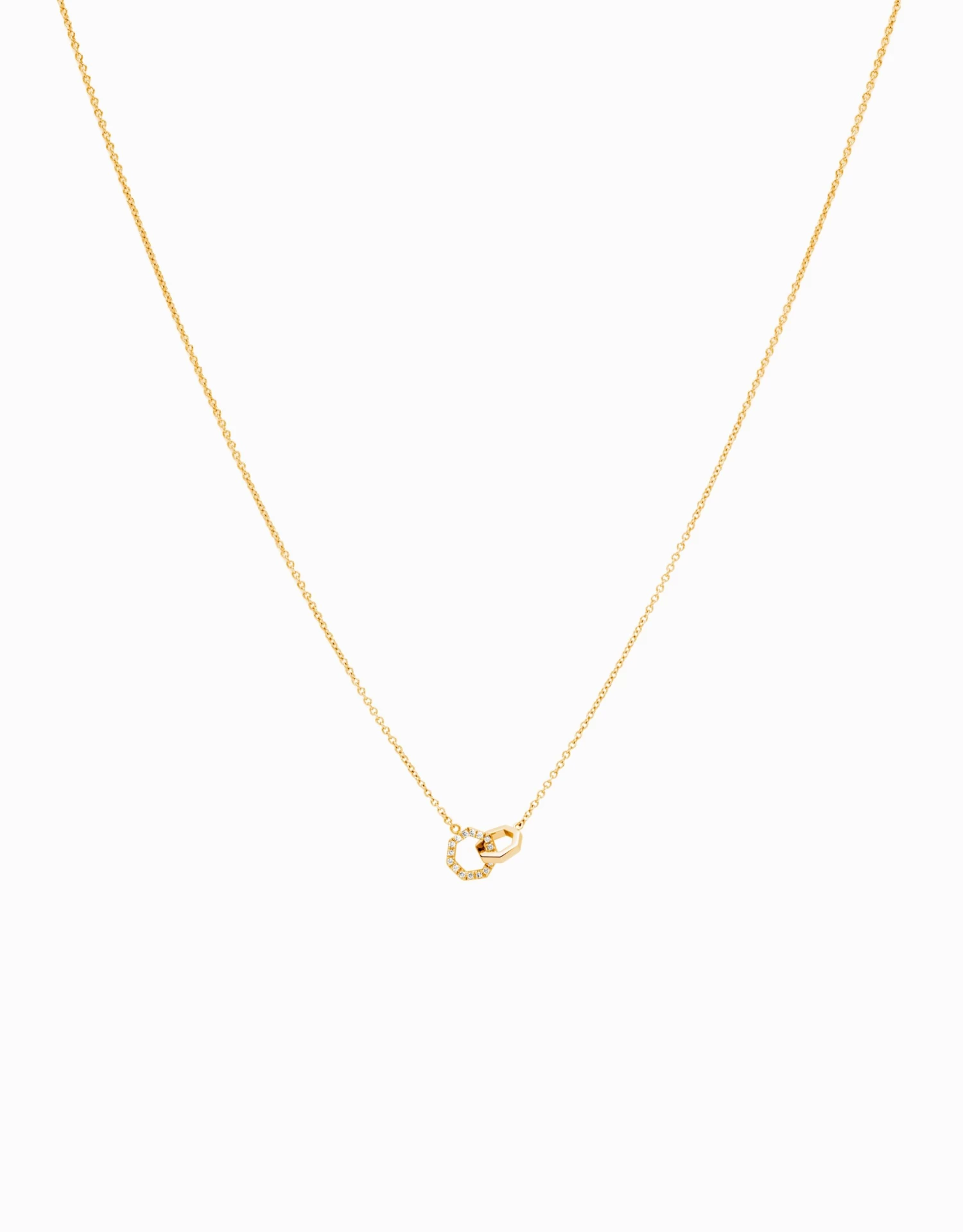 Un elegant i f脿cil de portar collaret d’or聽groc amb un gran valor simb貌lic: dos hept脿gons fusionats per crear un fort i etern enlla莽. En aquesta ocasi贸, un dels hept脿gons llueix gr脿cies a 16 diamants brillants de triple excel路l猫ncia. Fent d’aquesta joia, una pe莽a perfecta de joieria per a un 茅sser estimat. En Jordi Rosich tamb茅 ha dissenyat el bra莽alet de corda per crear un conjunt preci贸s.