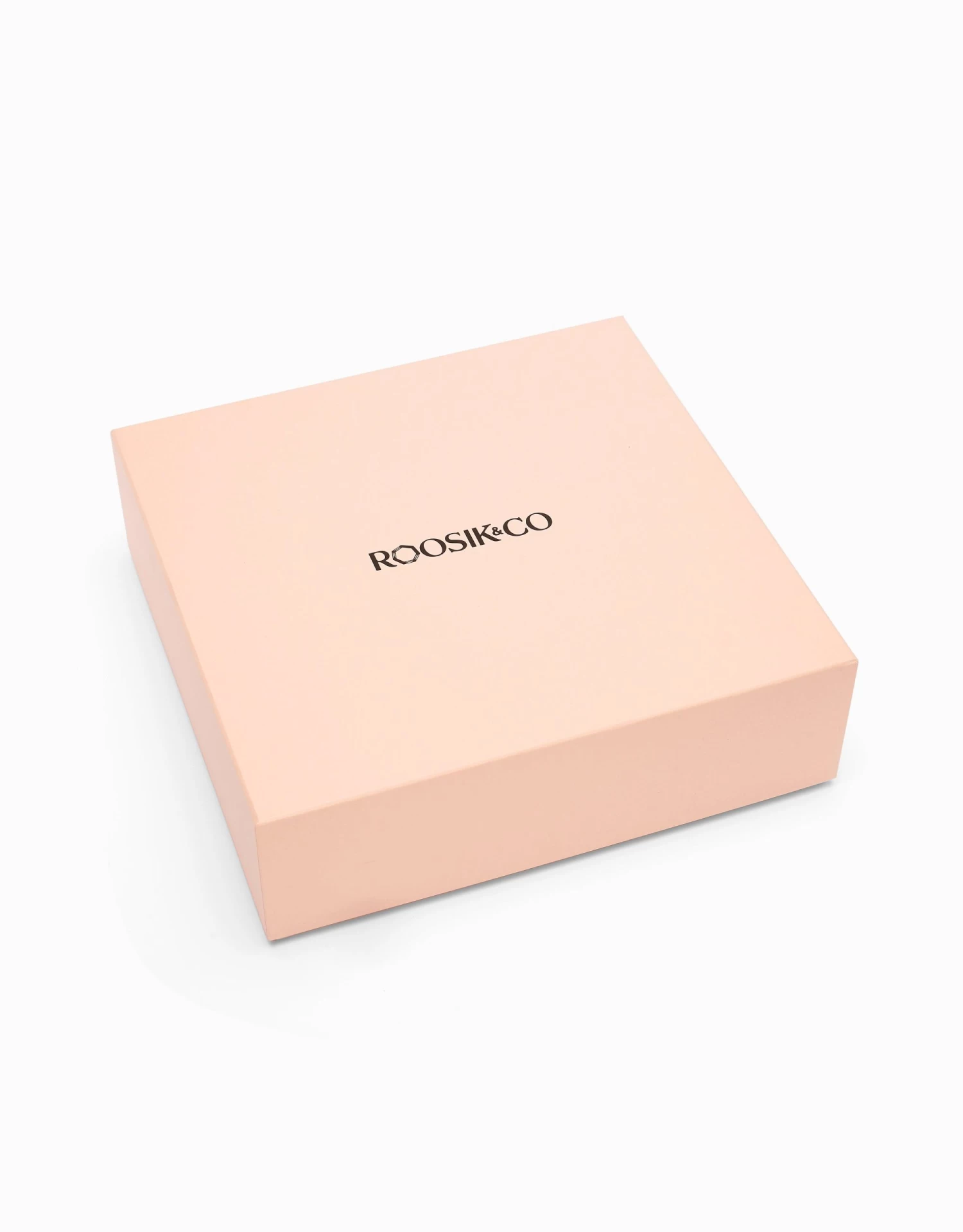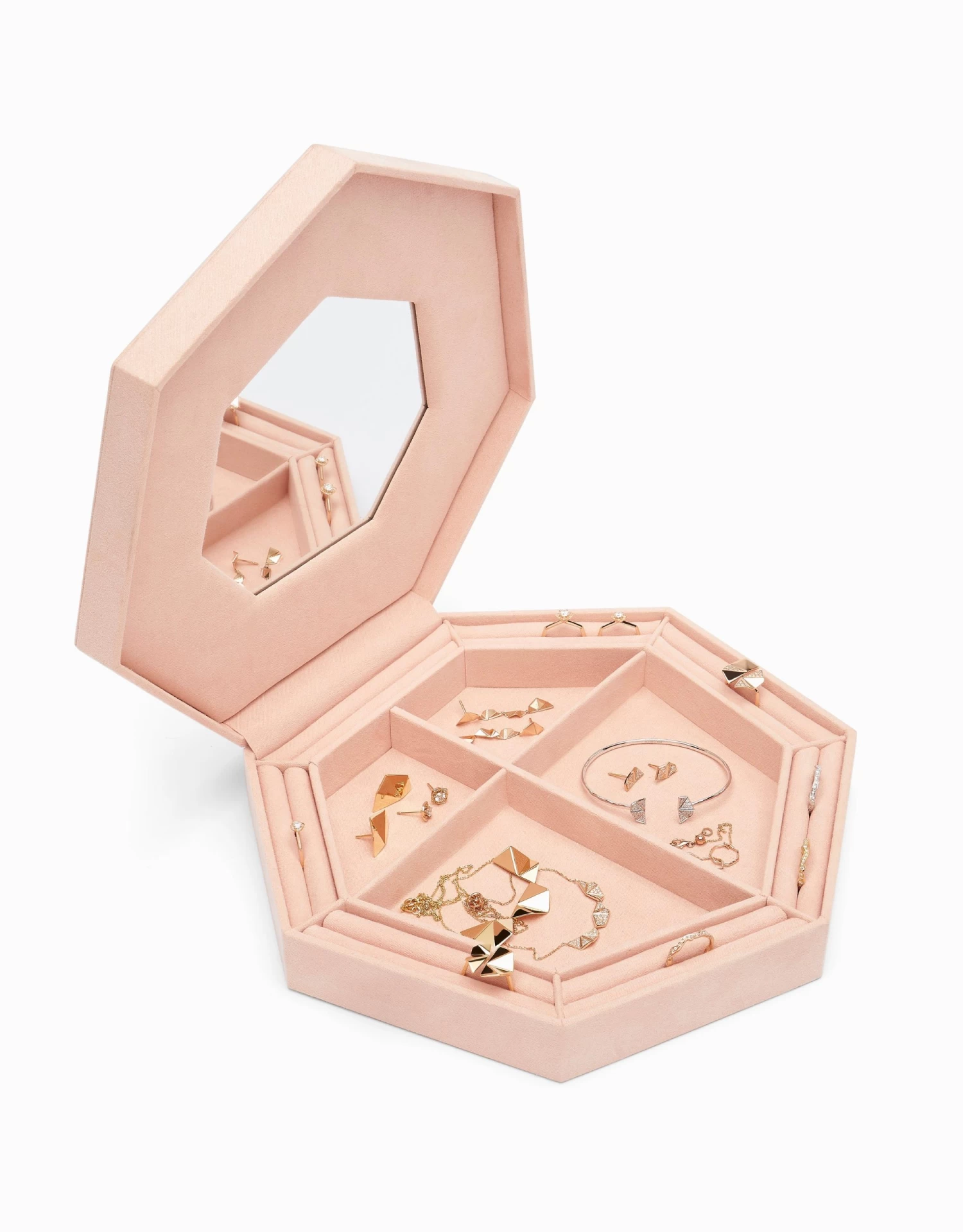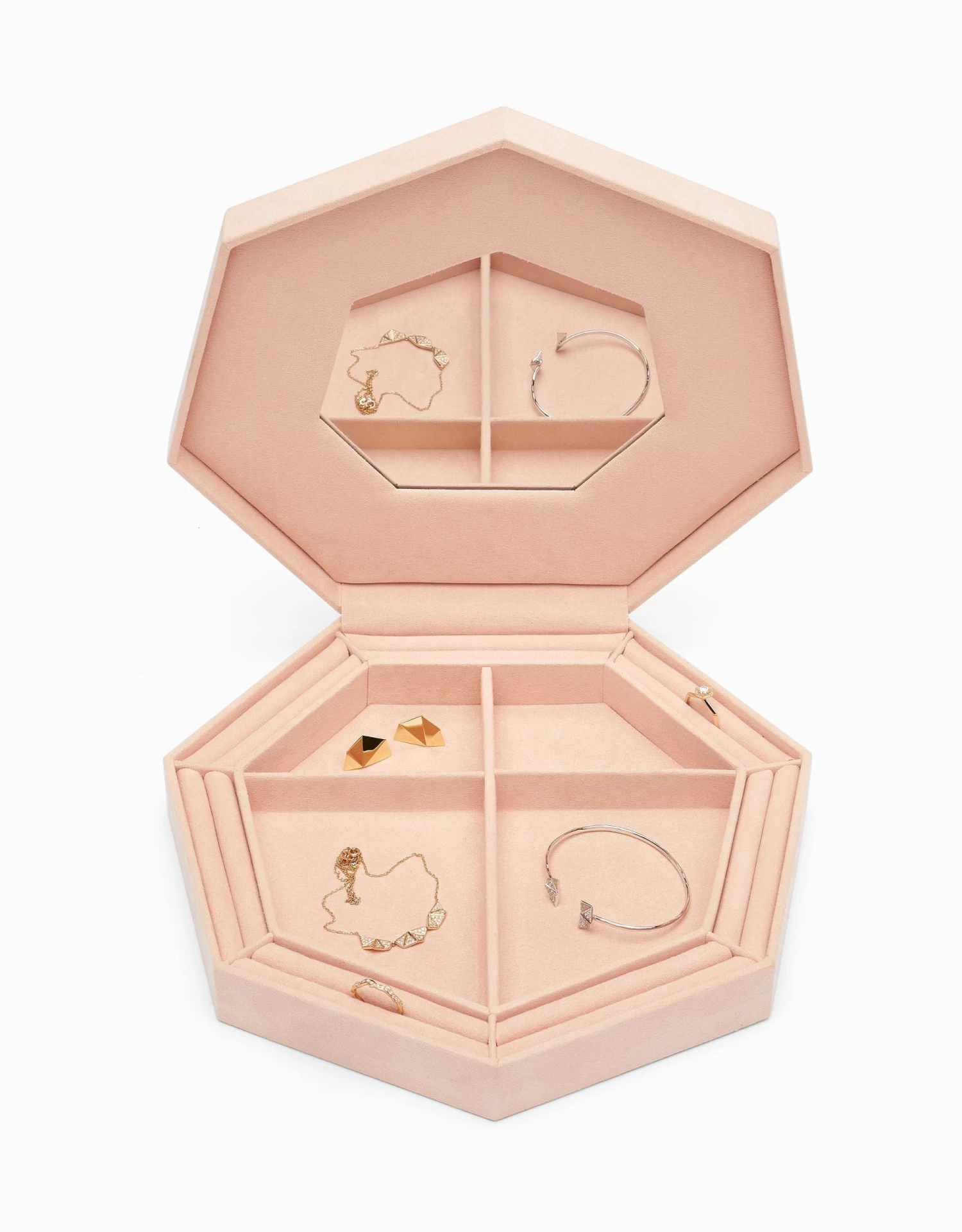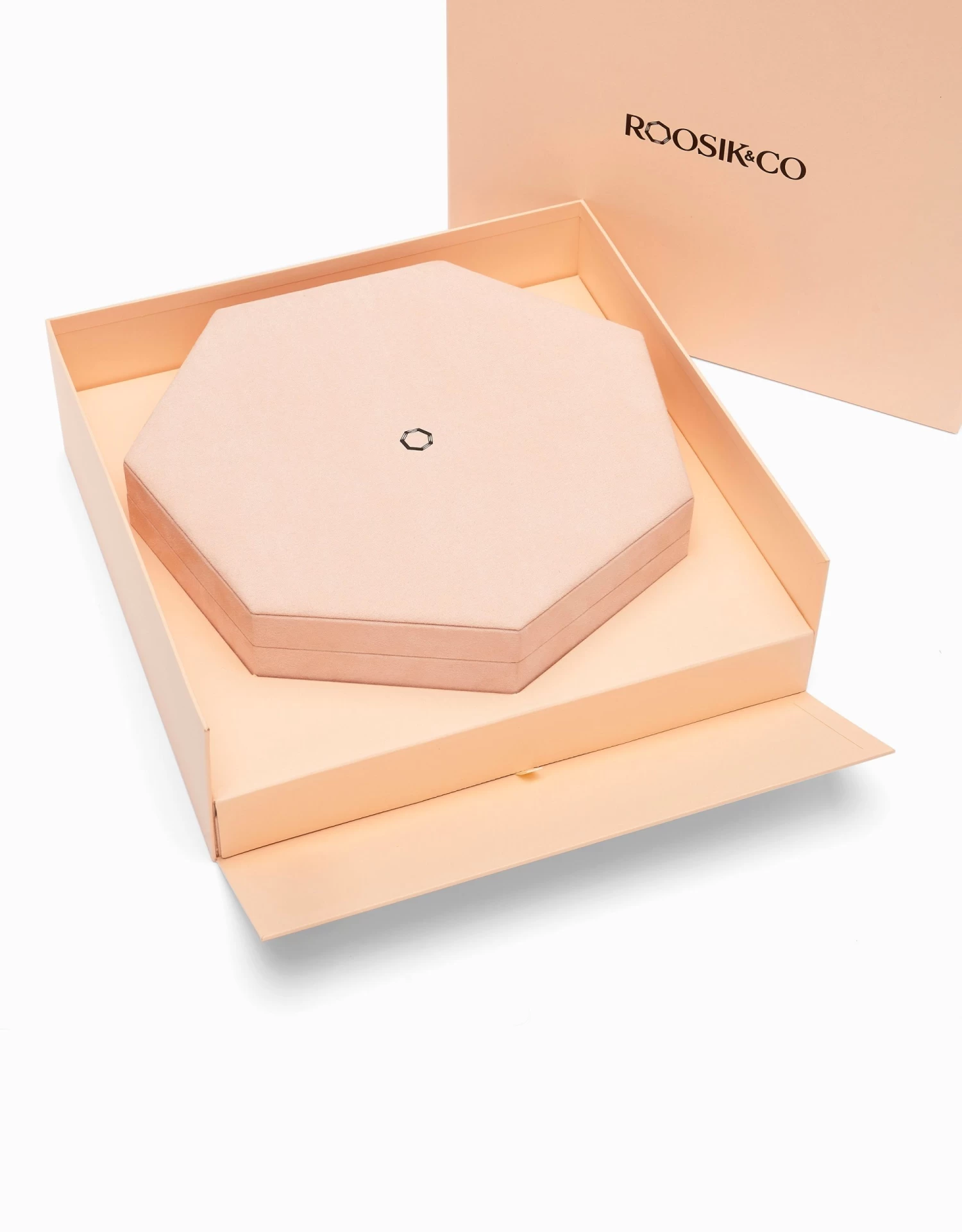 Si ja tens algunes joies de Roosik & Co, aquest joier t’encantarà. Podràs guardar-hi els teus anells, polseres, penjolls i arracades de manera ampla i còmode, cedint l’espai que cada peça es mereix. Cada dia al matí, quan et preparis per sortir, serà tot un goig obrir-lo i escollir la joia que millor et servirà per encarar el teu dia. El tacte és sedós i agradable i d’un color rosa nude, dolç i neutre, que et permetrà col·locar-ho amb facilitat a qualsevol lloc de casa teva. Potser sobre del tocador? Un regal imprescindible per a les que us agrada tenir cura de les vostres joies.