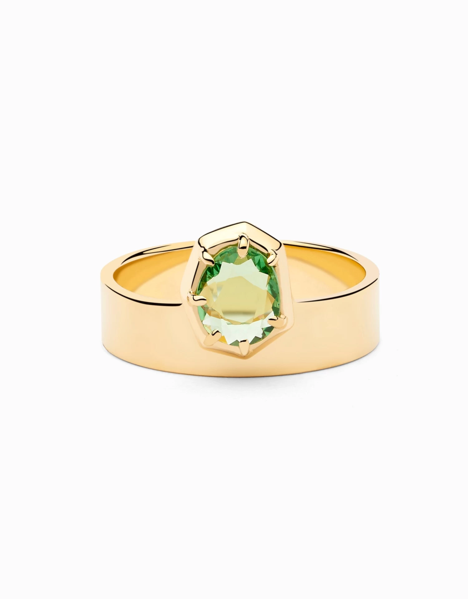 Jordi Rosich, joier i dissenyador de Roosik & Co, ha creat aquest anell d’or groc amb un granat verd, també conegut com a tsavorita, de tall i bellesa únics al món. Es tracta d’un granat verd sense igual. Cada gemma amb les que Jordi Rosich treballa aquesta col·lecció és incomparable, és per això que Rosich treballa a mida cada montura que sosté la gemma.