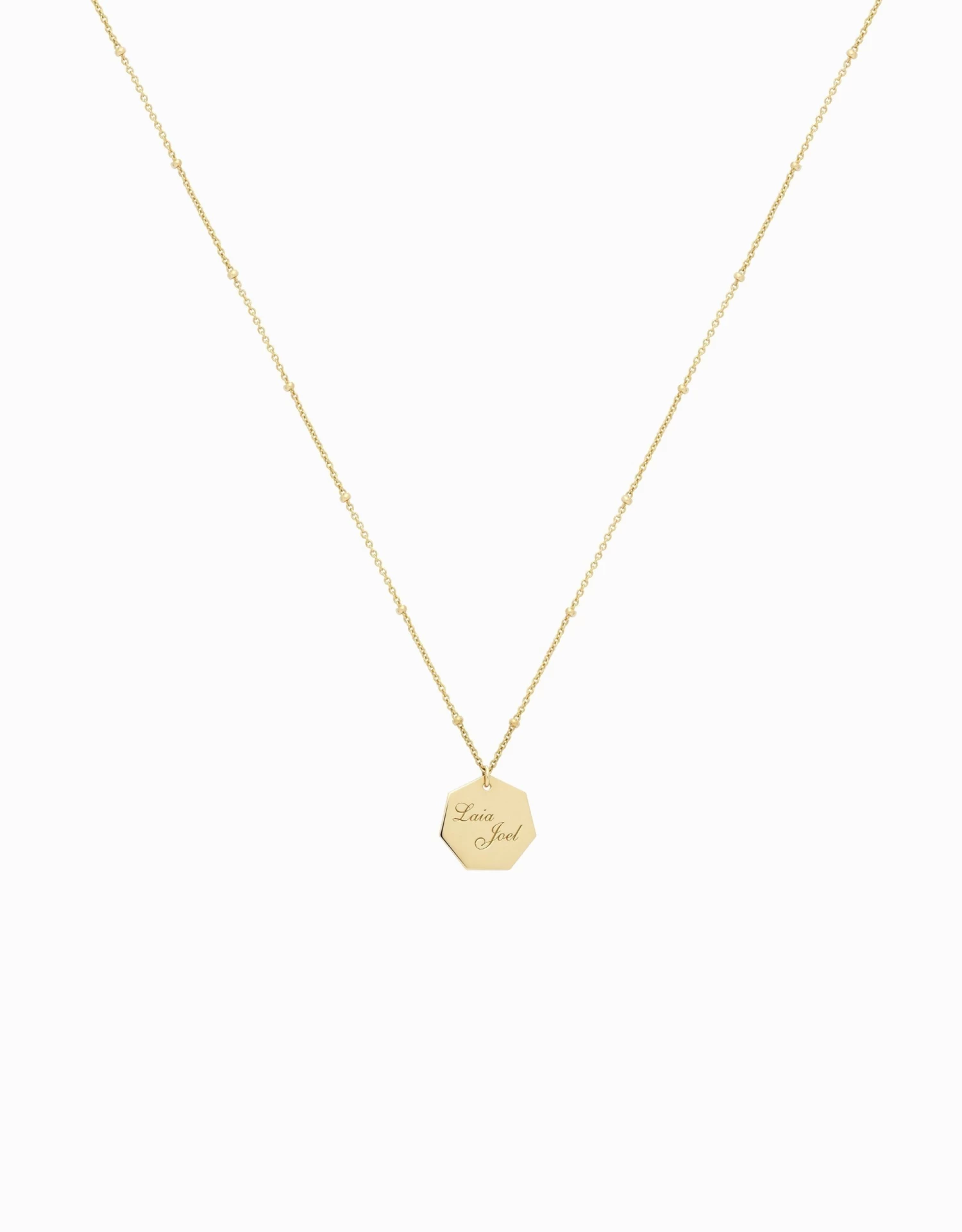 En aquest penjoll d’or de la col·lecció Heptasik, Jordi Rosich reinterpreta de nou el motiu Heptàgon – icònic de Roosik & Co. La peça amb 12 mm de diàmetre i perfectament polida és d’una bellesa geomètrica i pura que atrau totes les mirades, a més, permet escriure-hi els noms de les persones més estimades. L’heptàgon s’acompanya d’una cadeneta treballada amb petites borles d’or que aporten un toc de diversió i originalitat a la peça. S’ofereix en or groc, però també és possible crear-la en or rosa o blanc.