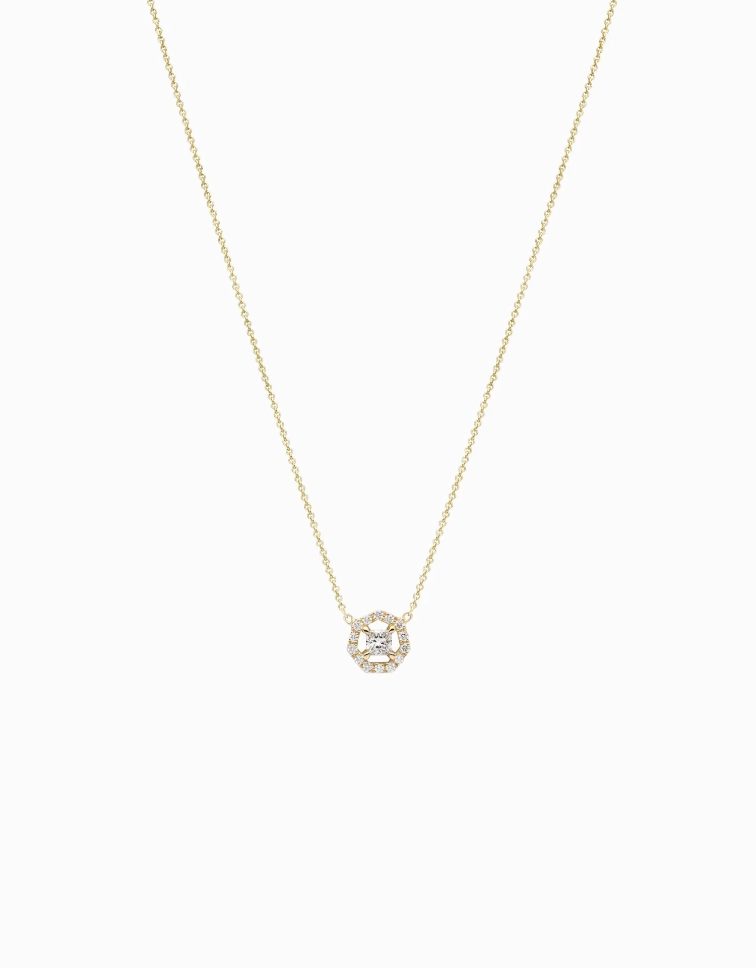 Un total de 14 diamants formen en aquest penjoll la característica composició heptagonal que és la icona inconfusible de la marca Roosik&Co. L’heptàgon abraça un diamant en talla princesa de 0,20 quirats certificat per Jordi Rosich. En aquesta ocasió, Rosich ha treballat amb l’or groc i els diamants per aportar calidesa a un disseny del tot actual, que forma un conjunt perfecte amb la polsera, l’anell i les arracades Vitruvik d’or groc amb motiu heptàgon i diamant.